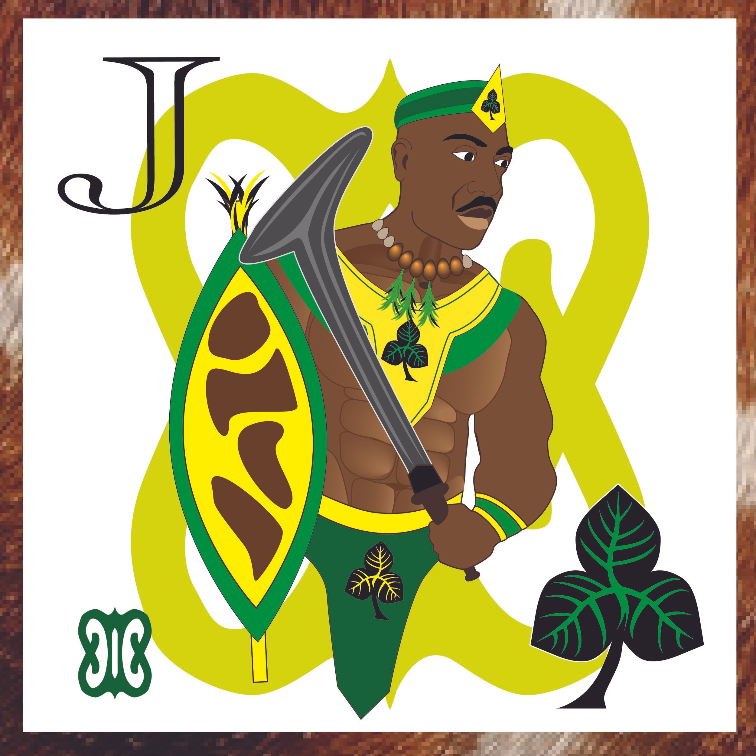 The Jack of Clubs holds a Gbaya. The Adinkra symbol in the background is Endurance.
