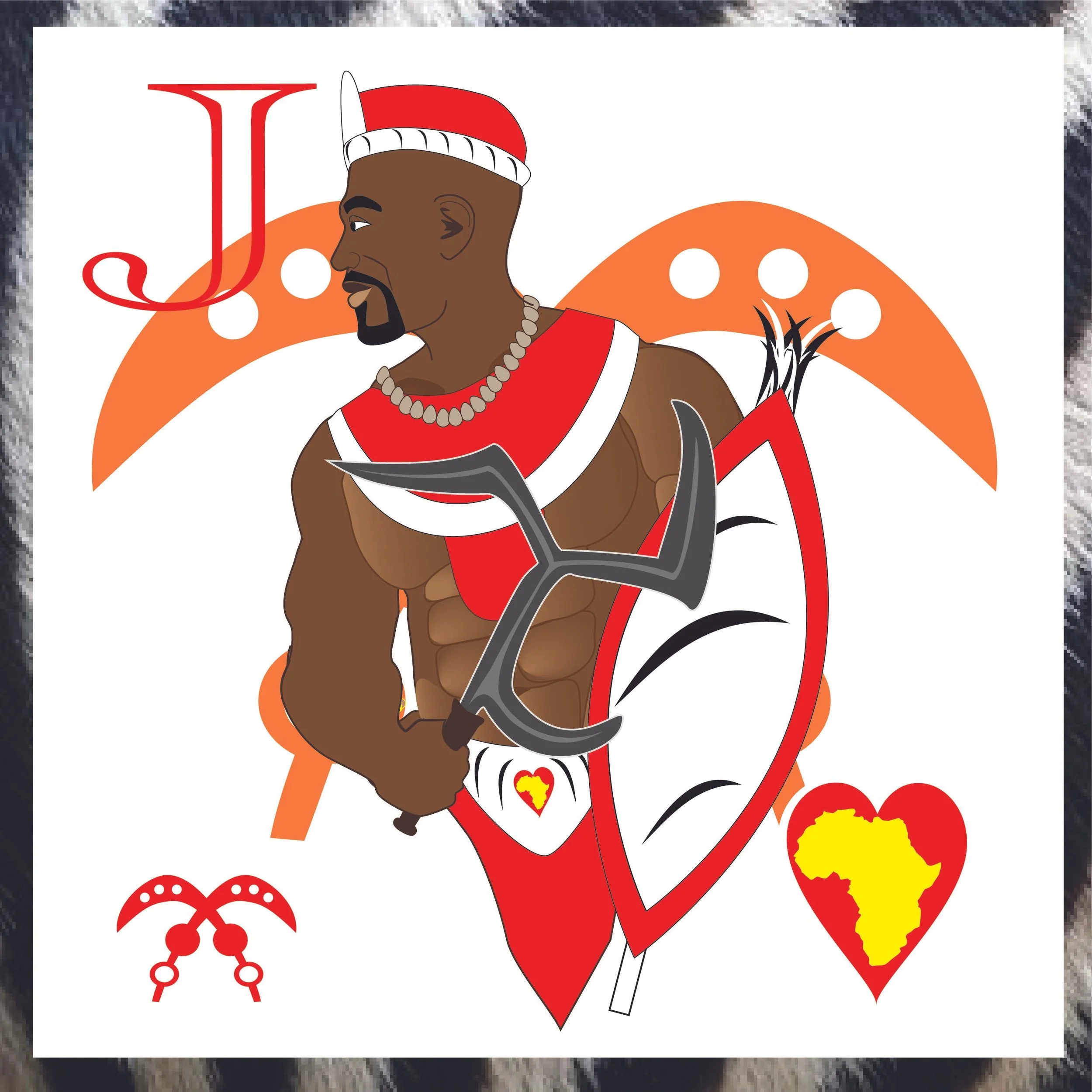 The Jack of Hearts holds a Kpinga. The Adinkra symbol in the background is Courage.