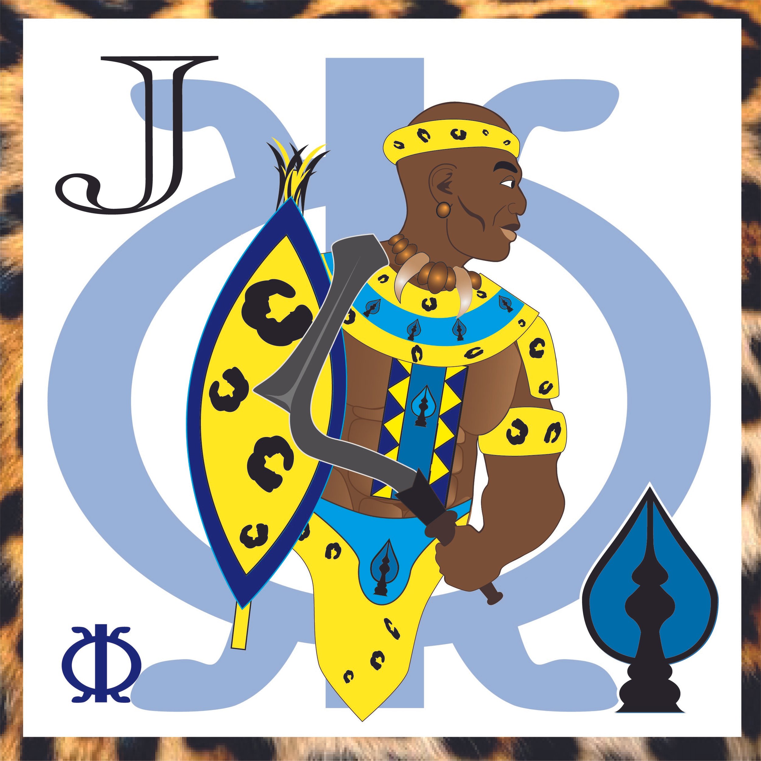 The Jack of Spades holds a Banza. The Adinkra symbol in the background is Perseverance.