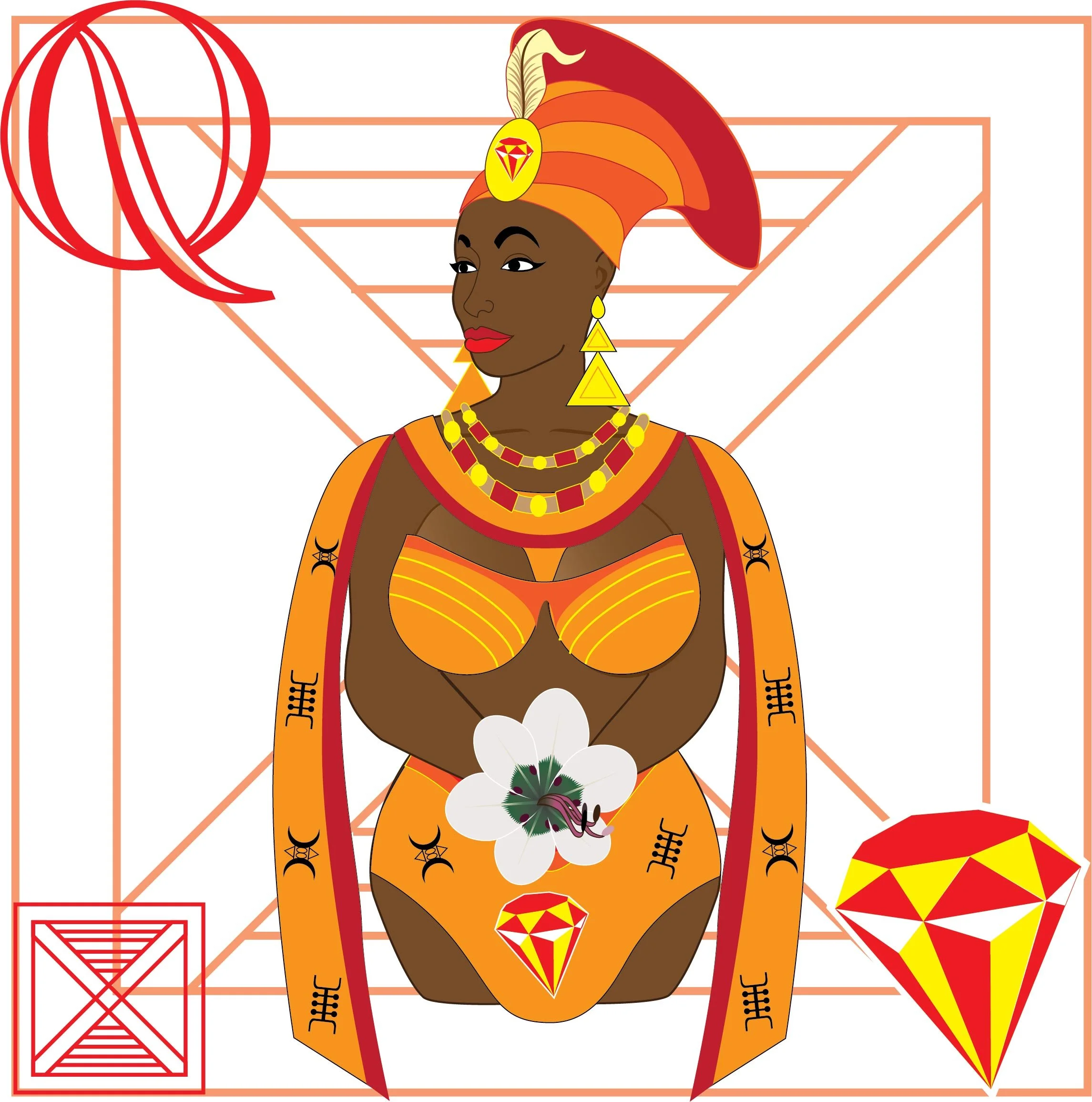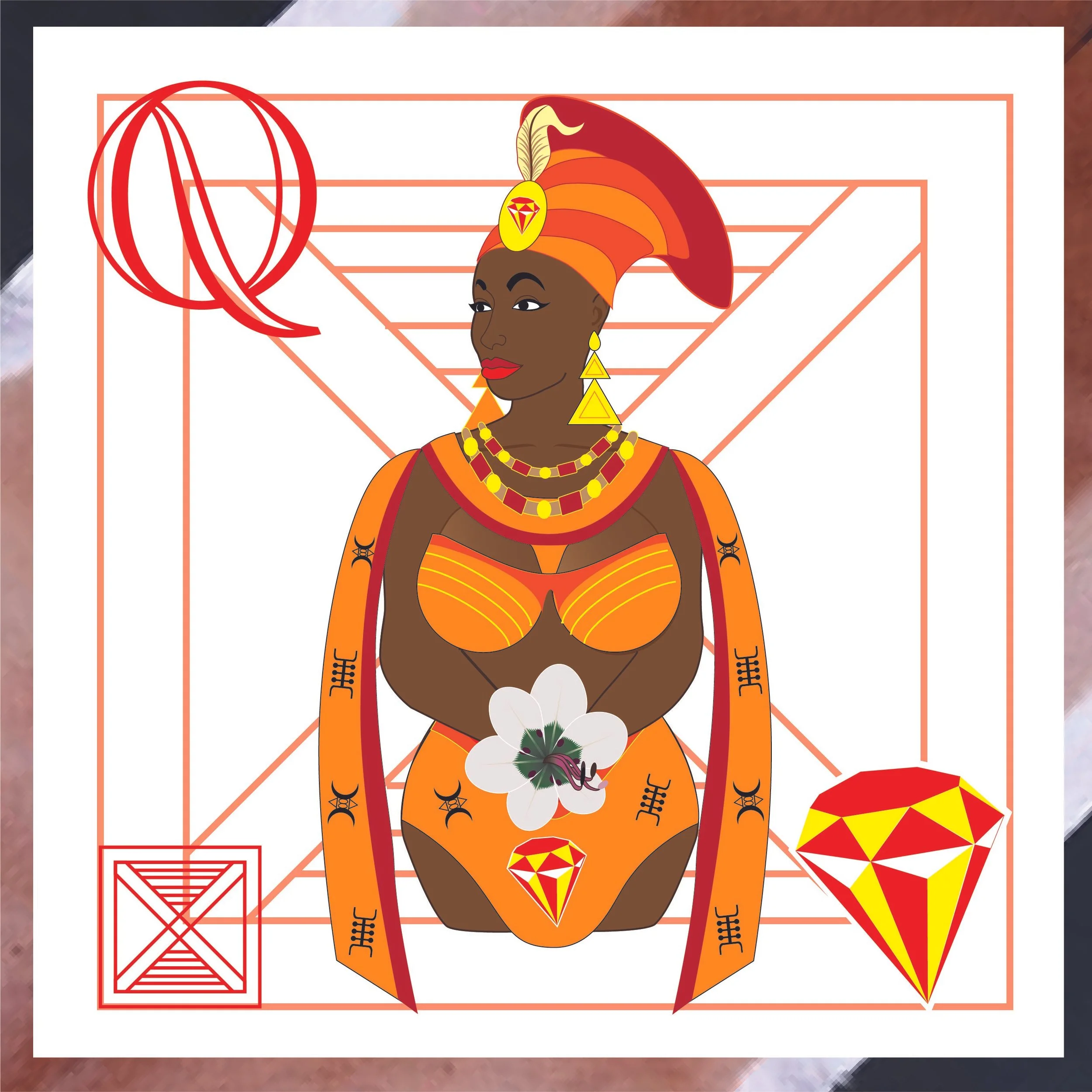 The Queen of Diamonds holds a Geissorhiza Tulbaghensis. The Adinkra symbol in the background is Fortitude.