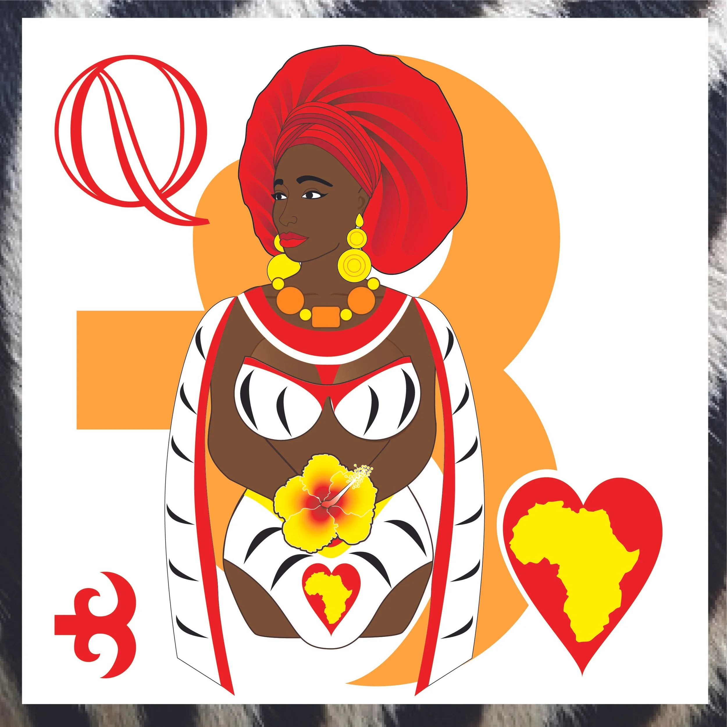 The Queen of Hearts holds a Wild Hibiscus. The Adinkra symbol in the background is Nurturing.